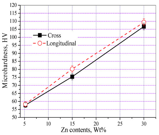 Figure 9 presents the microhardness measured on the polished sections of the LAMed porous Mg-Zn-Zr alloys. The microhardness of Mg-Zn-Zr alloys increased obviously with the increasing Zn. The average microhardness of the cross section and longitudinal section of E1 alloy was 57.67 HV and 58.28 HV. The microhardness of the cross section and longitudinal section of E2 alloy was 75.51 HV and 80.23 HV, while the microhardness of the cross section and longitudinal section of E3 alloy reached 106.75 HV and 109.36 HV. There are several main reasons for the improvement of the microhardness. Firstly, as the Zn content increases, the grain size of LAMed Mg-Zn-Zr alloys has been obviously refined. In accordance with the Hall-Petch relation [46], grain refinement can improve the microhardness of the magnesium alloys significantly. Secondly, with the increasing Zn content, the solubility of Zn in α-Mg matrix increases. On the basis of the solid solution strengthening theory [47], high solid solubility will induce excellent properties. For Mg-Zn-Zr alloys, the microhardness value is proportional to the solid solubility of Zn in α-Mg, therefore, solid solution strengthening is conductive to the increase of the microhardness as well. In addition, the effect of homogeneously precipitated hard brittle Mg7Zn3 phase on microhardness also should not be neglected. With the increase of Zn content, Mg7Zn3 phase increases and gets coarsen. The homogeneously distributed Mg7Zn3 phase with higher microhardness could impede the dislocation movement between the grains [48], resulting in the increased microhardness.