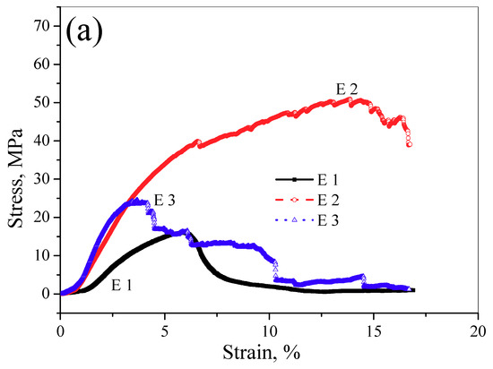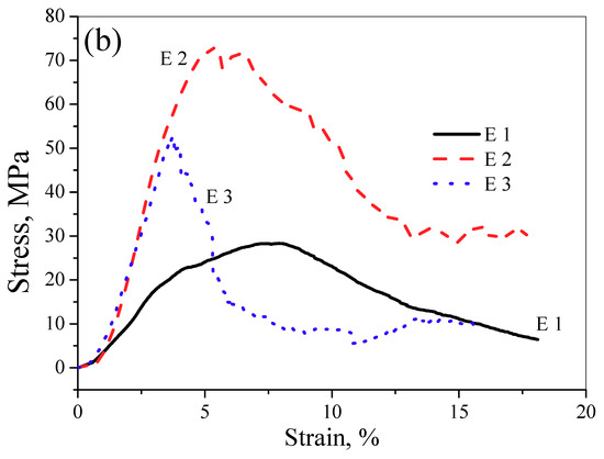 Figure 10 presents the compressive stress-strain curves of the LAMed porous Mg-Zn-Zr alloys and Table 5 lists the compression performance and microhardness of the LAMed porous Mg-Zn-Zr alloys and human bone. With the increasing Zn content, the UCS and elastic modulus values first improved obviously. In accordance with the Orowan mechanism [49,50], the enhancement of mechanical properties mostly ascribed to the precipitation strengthening of intermetallic compound Mg7Zn3 phase and MgZn phase. Besides, the effect of fine grain strengthening and solid solution strengthening could not be ignored. On the contrary, when Zn content reached 30 wt.%, the mechanical properties of E3 alloy decreased significantly. As can be seen from Figure 5c, the surface of E3 was uneven and collapsed, therefore, the density of the skeleton part of E3 is relatively poor. Furthermore, the coarsening of intermetallic compound Mg7Zn3 phase tends to generate the source of cracks at grain boundaries. Due to the design of distribution mode of the reserved apertures in the experiment, the longitudinal mechanical properties of porous Mg-Zn-Zr alloys are superior to the horizontal mechanical properties. As listed in Table 5, the UCS and elastic modulus of the LAMed porous Mg-Zn-Zr alloys are slightly lower than those of the compact bone but much higher than those of the cancellous bone [7,51]. As a result, the porous Mg-Zn-Zr alloys prepared by LAM, especially with Zn content no more than 15 wt.%, are very promising biodegradable materials for cancellous bone.