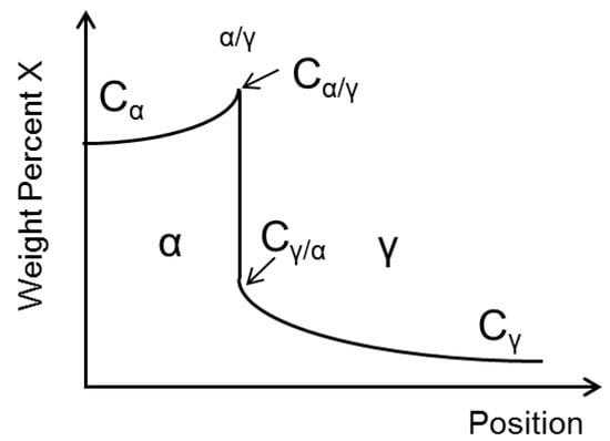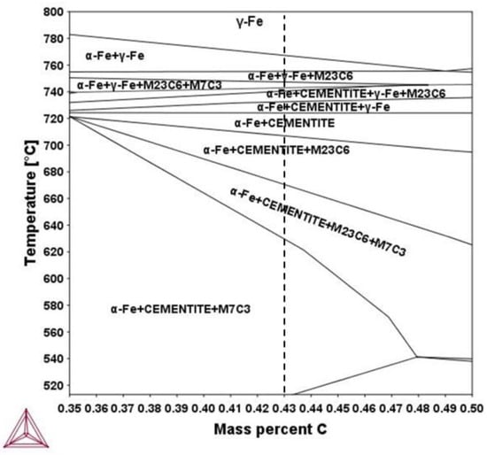 Thermodynamic and kinetic calculations have been conducted using the TCFE8 database from Thermocalc® software (Version 2018a, Thermo-Calc Software AB, Solna, Sweden) in conjunction with the MOBFE3 database from DICTRA software (Version 2018a, Thermo-Calc Software AB, Solna, Sweden). Using Thermocalc®, the phase diagram of the CrMo steel was calculated in order to predict the stable phases expected in equilibrium (Figure 1). Two types of carbides are expected in equilibrium: Cementite and M7C3 carbide. M23C6 carbide was not considered to affect the α to γ transformation; hence, the results of M23C6 dissolution were excluded for simplicity. Using DICTRA, the dissolution of carbides, the ferrite to austenite transformation and the chemical gradients across interfaces between carbides and the matrix (α/γ) were studied during heating and holding at 950 °C. The chemical composition of the phases was determined with Thermocalc® at equilibrium by taking the volume fractions of the components into consideration. Silicon (Si), due to its minor solubility in carbides is removed from the system, which takes into account the elements Fe, C, Cr, Mn and Mo. The carbides were assumed with spherical shape and initial size was set to 5 nm and 200 nm, respectively, as derived by the TEM observations. Since transformation temperatures shift at higher values by increasing the heating rate [], results obtained from the dilatometry, such as the exact heating rate (200 °C/s) and the actual A1 200 °C/s and A3 200 °C/s of austenite transformation (810 °C and 900 °C, respectively) as designated in the dilatometry curve in Figure 2, are used as an input in the simulation. At the interfaces of carbides with ferrite or austenite was assumed thermodynamic equilibrium (local equilibrium hypothesis). At 810 °C, the austenite is set to nucleate and grow at the interface of carbides with ferrite. In order to understand the concentration profiles calculated by DICTRA, a schematic representation of them is given in Figure 3. In this figure, Cα is the Χ concentration in α phase, Cα/γ is the X concentration in α phase as expected by equilibrium, whereas Cγ/α is the Χ concentration in γ phase as expected in equilibrium. Cγ is the current Χ content of the γ phase.