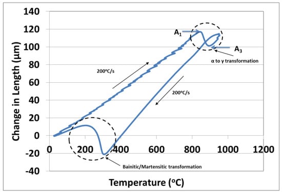 Dilatometry curve of CrMo steel after the UFHT. The change in length at high temperature designates the α to γ transformation. The new A1 and A3 temperatures are shifted substantially to 810 °C and 900 °C, respectively.