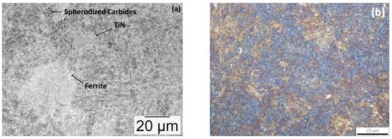 The optical micrograph of the microstructure before and after UFHT is displayed in Figure 4a,b, respectively. The initial microstructure in the soft-annealed condition consists of spheroidized carbides homogeneously dispersed in a ferritic matrix with grain size ranging within 2–10 μm (Figure 4a). The microstructure gained after the UFHT (Figure 4b) is very fine and its constituents cannot be identified clearly on OM, not even at higher magnification. Tint etching has colored areas of the sample differently. According to reference [], the blue areas indicate possible presence of bainite, while the brown regions indicate martensite laths. In addition, white areas randomly allocated in the microstructure are correlated with carbides or could depict retained austenite.