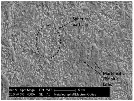 SEM image of the microstructure gained after UFHT. Martensitic/bainitic laths are descernible as well as coarse spherical paricles.
