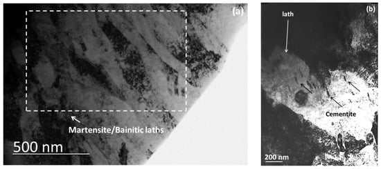 Figure 6 and Figure 7 show bright field TEM micrographs of the obtained microstructure after UFHT, indicating the mixed nature of the final microstructure with the coexistence of martensite and bainitic ferrite laths and the different carbides (Cr carbide M7C3 and cementite) of various nano-sizes. The contrast in bright field TEM between laths indicates difference in dislocation density. Darker areas have high dislocation density and thus they are correlated to martensitic laths, whereas lighter areas present lower dislocation density suggesting the formation of bainitic laths (Figure 6a). In addition, laths in which fine elongated cementite have precipitated at the interior with orientation, indicate the appearance of bainitic laths (Figure 6b). The diffraction patterns in Figure 8 are taken from the chromium enriched carbide of the type Cr7C3 (Figure 7a) and the cementite (Figure 7b).