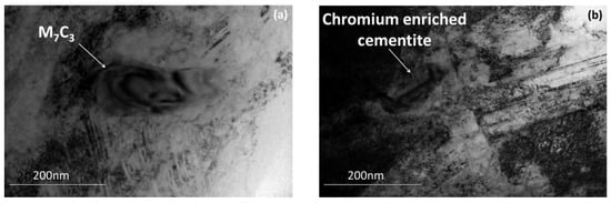 TEM micrograph of microstructure after UFHT (a) Chromium carbide M7C3 in the microstructure after UFHT; (b) chromium-enriched cementite near grain boundaries.