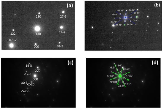 Indexed pattern of Figure 7 (a) chromium carbide of the type Cr7C3; (b) detected vectors of Cr7C3; (c) chromium-enriched cementite; (d) detected vectors of cementite.