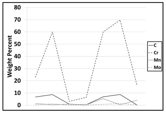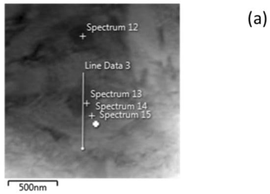 The line scan from the TEM-EDS analysis shown in Figure 9 indicates that significant chemical heterogeneity exists in the microstructure on both sides of a carbide. Table 2 shows the spectra of the points 12, 13, 14, 15 of Figure 9a. These data prove that during the rapid reheating, the microstructure has not had the time to homogenize through diffusion; therefore, the chemical gradients existing at the microstructure prior to UFHT has not been smoothed and exist at the microstructure at peak temperature. Different C concentration and element segregation at the peak temperature serve the setting of different transformation products during the final quench.