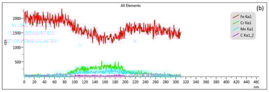 (a) Line scan in the microstructure after UFH; the darker feature corresponds to a carbide; (b) line scan diagram showing chemical heterogeneity.