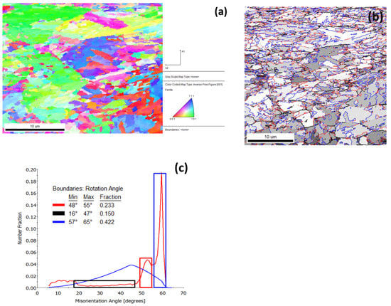 (a) Normal direction (ND) Inverse Pole Figure (IPF) map, (b) Grain Average Image Quality map presenting the different types of boundaries, (c) chart with number fraction distribution of the misorientation angles in the EBSD scan. The colors shown in legend are used to delineate the grain boundaries in Figure 10b.