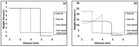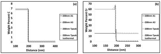 DICTRA results (see Figure 11a and Figure 14a) as well as TEM–EDS analysis (see Figure 9) indicate that at the peak temperature after ultrafast heating, chemical heterogeneity in C exists in austenite. The partitioning of substitutional atoms, especially Cr, is considered to significantly affect the austenite formation.