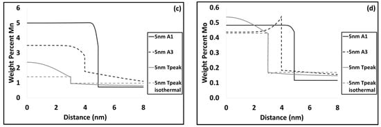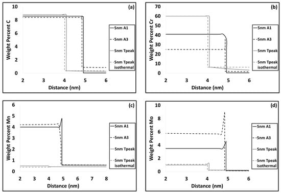 Variation of carbon (a); chromium (b); manganese (c) and molybdenum (d) at the interface of cementite and austenite at various critical temperatures for 5 nm.