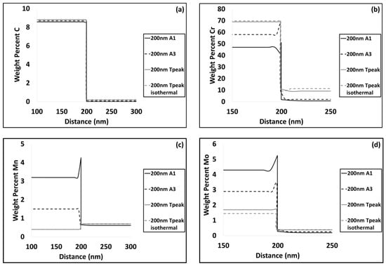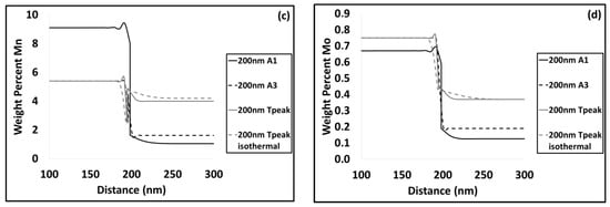 Variation of carbon (a); chromium (b), manganese (c) and molybdenum (d) at the interface of cementite with austenite at various critical temperatures at 200 nm.