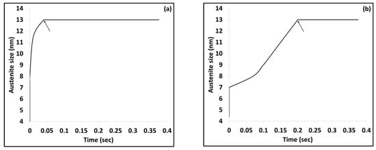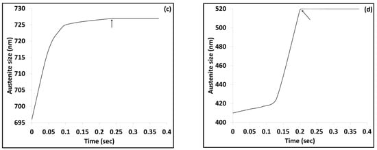 Figure 16 shows the simulation results from the ferrite to austenite transformation in conjunction with time. The graphs show that the completion of α → γ transformation is delayed next to M7C3 carbide on fine and coarse carbides (see Figure 16b,d). This fact suggests that the strong Cr enrichment retards the C diffusion, leading to austenite areas depleted in C. In case of fine cementite, the austenite formation occurs rapidly, hence the enrichment in C. In case of coarse cementite, the austenite formation is substantially delayed (see Figure 16a,c). Furthermore, the existence of undissolved carbides during ultrafast heating act as nucleation points for austenite, while preventing austenite grain growth, hence the refined PAGBs.