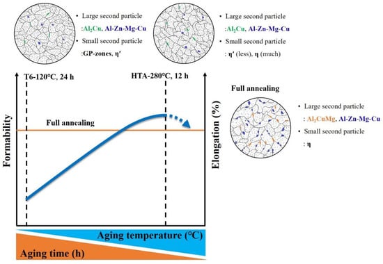 - The high temperature aging at 280 °C, 12 h had fewer large particles (Al-Cu phase) in the Al matrix than full annealing did. The nucleation of microvoid and microcrack was located frequently around the large particles. The defects form cracks mainly and cause the fractures of the sample. Hence, the high temperature aging at 280 °C, 12 h presented to be superior over full annealing in regard to the work hardening rate and formability.