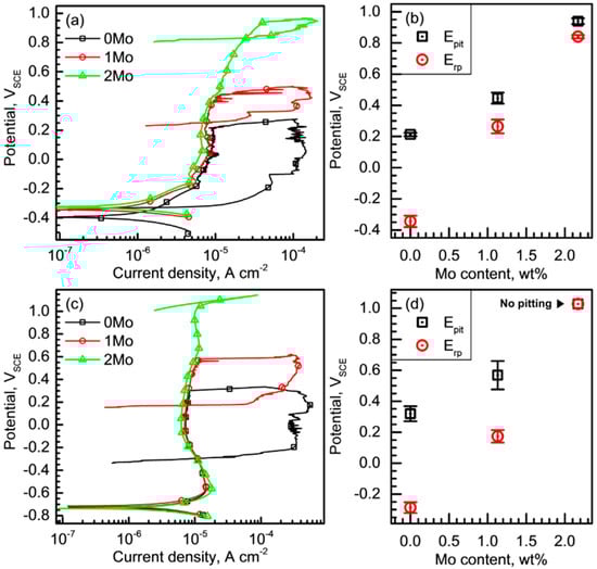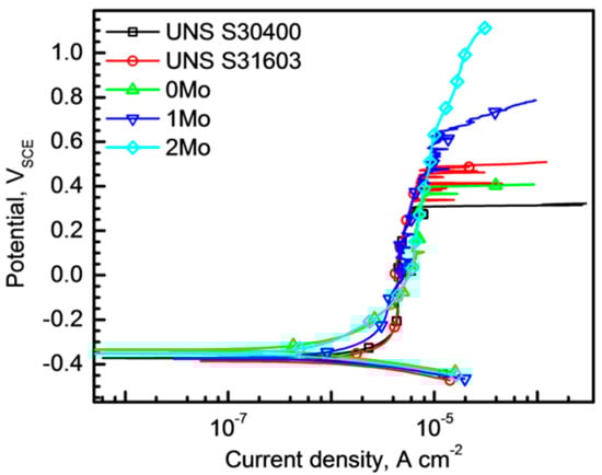 The polarization curves in Figure 4a show changes in other features by addition of Mo, such as ipassive and number of metastable pitting corrosion events. The lowest ipassive value is observed in the 2Mo alloy in the entire potential range, and the ipassive decreases from 8.3 to 5.8 µA/cm2 (at 0 VSCE, for example) as the Mo content increases. Moreover, small current spikes indicating the initiation and repassivation of metastable pits are more frequently observed in the polarization curve of the alloys with lower Mo content.