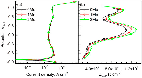 (a) Potentiodynamic polarization curves of 0Mo, 1Mo, and 2Mo alloys measured in a borate-phosphate-citric buffer solution (pH 8.5) at 25 °C (dV/dt = 1 mV/s). (b) Graphs of real part of the impedance (Z′real) versus applied potential of the alloys measured in the same solution by imposing sinusoidal voltage perturbation (±10 mV) at a frequency of 0.1 Hz.