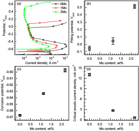 (a) Potentiodynamic polarization curves of 0Mo, 1Mo, and 2Mo alloys measured in a 4 M NaCl + 0.01 M HCl solution at 25 °C (dV/dt = 1 mV/s). Average (b) pitting and (c) corrosion potentials, and (d) critical anodic current density values with standard deviation (scatter band) of the alloys.