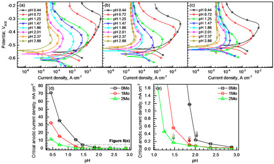 Potentiodynamic polarization curves of (a) 0Mo, (b) 1Mo, and (c) 2Mo alloys measured in 4 M NaCl + HCl solutions with different solution pHs of 0.44–2.88 at 25 °C (dV/dt = 1 mV/s). (d) Graphs of average critical anodic current density values with standard deviation (scatter band) of the alloys versus solution pH. (e) A magnified part of graphs in Figure 7d.