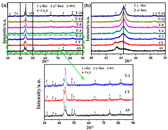 The X-ray diffraction patterns of the iron matrix composites before and after deep cryogenic treatment are shown in Figure 1. In Figure 1a, the austenite γ-fcc and martensite α′-bcc solid solution are dominant in the iron matrix composites, as shown by the marked diffraction peaks. The WC and Cu2S are also important parts of the composites which are marked by numbers 3 and 4. The WC can enhance the wear property of iron matrix composites. The Cu2S is a good lubricant [34], which comes from the reaction of Cu and MoS2 during the sintering process [35]. And the resultant Mo element dissolves into the base to strengthen the iron base. In Figure 1a, the diffraction peaks of α′-bcc are weaker than γ-fcc in AS and CT specimens. During the process of sintering, the elements Mo, Ni, Cr dissolve into the iron matrix. Since the Mo, Ni and Cr are austenite stable elements and can reduce the Ac1 and Ms transformation temperature [24,25,36,37], most of austenite exists at room temperature. As shown in Figure 1b, the diffraction peaks of α′-bcc strengthens gradually with the increase of deeply cryogenic treated time, meaning the increase of the content of α′-bcc phase. Magee et al indicated that the content of martensite was determined by the cooling temperature, namely, where φ is the volume fraction of martensite, Ms indicates the start of martensite transformation, and Tq is the cooling temperature [38]. Further, Cotes et al. studied the Gibbs energy modelling of driving forces and calculation of martensitic transformation and defined the driving force as the difference for the forward transformation increases with decreasing temperature [39]. Therefore, the deep cryogenic treatment can enhance the driving force of phase transformation of γ and α.