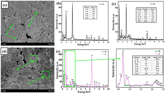 The microstructures of AS and CT specimens measured by SEM and EDS are shown in Figure 2. According to the EDS results in Figure 2e, the base of AS and CT is the solid solution of iron, which contains elements Ni, Cu, Cr and Mo in accord with the XRD results. In Figure 2a, the dark gray substance A and white particles B distribute in the base. As the EDS shown in Figure 2b,c the dark gray substance A mainly contains elements Cu and S, which comfirms the results of XRD of Cu2S. During the sintering process, the reaction of Cu and MoS2 occurred and Mo elements dissolved into the base to strengthen the matrix. From the EDS results in Figure 2c, the white particles B consists of W and C elements, and the existence of WC is also shown in the XRD. In Figure 2d, the martensite transformation had begun to happen in someplace D. Compared with the EDS of area C and D, the content of Mo, Ni, Cr, Cu in area D is poorer than in area C. Since the Mo, Ni and Cr are austenite stable elements and can reduce the Ac1 and Ms transformation temperature, most of austenite exists at room temperature and the martensite transformation would only happen in the area D at room temperature. This result is in agreement with the report by Ahmed et al. [40], in which the effect of Ni and Mo concentrations on the phase transformation and mechanical properties of 18Ni (350) maraging steel were studied and it indicated that both the elements acted as strong austenite stabilizers. When 7.5% Mo and 24% Ni are added in combination, the austenite phase obtained at room temperature did not transform to martensite.