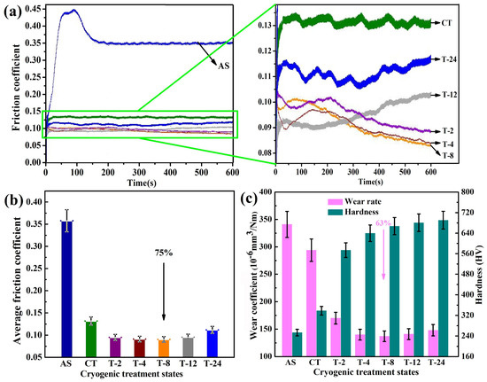 The effects of cryogenic treatment on the friction coefficient of the iron matrix composite are shown in Figure 4a,b. As shown in Figure 4a, the friction coefficient decreases significantly after deep cryogenic treatment. In Figure 4b, the average friction coefficient of deep cryogenic treatment of samples decreases firstly and increases subsequently with increasing deep cryogenic treatment time from 2 h to 24 h. The average friction coefficient of the iron matrix composite subjected to deep cryogenic treatment for 8 h achieves the lowest value. The lowest value (0.09) is reduced by 75% in comparison with AS (0.36). It is noted that the friction coefficient obtained in this work not only reflects the average friction behaviors but also illustrates the local relation between friction force and normal forces, like the maximum or minimum friction coefficient in Figure 4a. Compared with the results in this work, Lacalle et al. [44] defined the specific coefficient Ks = Ftooth/(ap·fz), where Ftooth is the maximum cutting force, ap is the depth of worn surface, and fz is the tooth passing frequency), which is similar to the friction coefficient and reflects the maximum force during cutting.