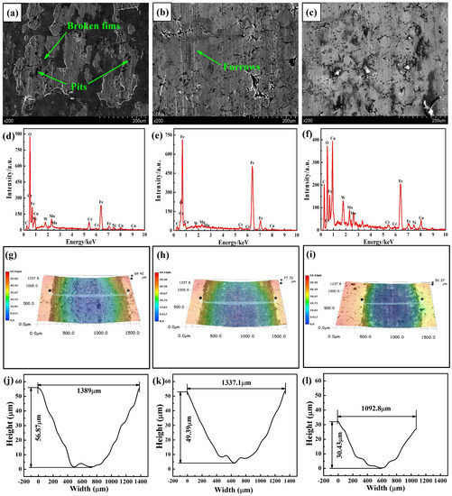 At the initial stage of wear, the iron base firstly deformed and extruded, accompanied with the removal of the iron base, and a large number of lubricants became more prone to be pulled out due to weak iron base support. In Figure 5a,g,j, the worn surface of the as-sintered specimen displays severer damage and rougher structure than the specimens processed by the deep cryogenic treatment. The worn surface is covered by wear debris and peeling pits, and the wear scar is considerably wider and deeper. This reveals that the adhesion and scuffing occurred in this case, and AS has a weakly anti-wear performance with a large wear coefficient. In Figure 5b,h,k, after the treatment of CT, the worn microscopic surface shows decreased signs of plastic deformation, the wear scars become relatively shallow, but there are still many furrows on the surface, and the wear scar is still wide and deep. The worn surface of the iron matrix composite after deep cryogenic treatment for 8 h is reasonably smooth, only a slightly loose wear debris exists on the worn surface, and the wear scars become smaller as shown in Figure 5c,i,l. This is due to the martensite phase transformation and precipitation of carbides in the iron base, enhancing the hardness and strength of the base, which improves the wear resistance of composites. This result is in agreement with the wear coefficient as shown in Figure 4c. The EDS analysis of the worn surface was performed to confirm the generation of the film and their composition. In Figure 5d,e, the intensity peaks of O and Fe demonstrate the reaction of the base with oxygen [45] and direct contact between the friction pairs happened during the wear test. In Figure 5f, the high intensity peaks of Cu and O come from the reaction of lubricant phase Cu2S and oxygen during the wear test, which indicates the formation of an adherent Cu2S film. It is believed that after deep cryogenic treatment, the iron base can support the film effectively and easily form protective film to prevent the direct contact [35,46].