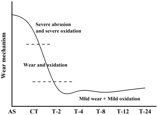 Wear mechanisms depicted in Figure 6 have clearly explained the different tribological mechanisms of samples without deep cryogenic treatment and with deep cryogenic treatment [47]. For the AS sample, severe damage and severe oxidation occurred during the process of sliding wear. Due to the weakness of the base, lubricant films cannot form integrally and be rubbed away easily without the effective support of the matrix, which results in the direct contact between the matrix and counterparts. The contact surface of the matrixes were damaged and oxidized seriously. After conventional treatment, there is a slight decrease of wear and oxidation in the worn surface with the small increase of the matrix. After deep cryogenic treatment, only mild wear and oxidation exists on the worn surface. Intact lubricant film can be generated with the support of a high strength matrix, which can prevent direct contact [48]. Menezes [49] investigation concluded that solid lubricant film can prevent direct contact between mating surfaces and can reduce the friction coefficient and wear coefficient.