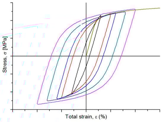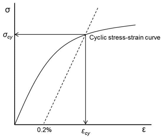 It is well known that the strain-based approach can better characterize the fatigue behavior in the low-cycle region of a material than the stress-based approach [15,16]. The first procedure in the strain-based approach is to obtain the cyclic stress–strain curve of the specified material. As shown in Figure 1, the cyclic stress–strain curve is determined by connecting the maximum points of the stable hysteresis loops obtained by the results at different strain amplitudes. The cyclic stress–strain curve can be represented using the Ramberg–Osgood relationship as follows: