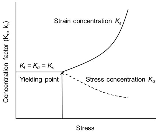 As shown in Figure 2, the concentration factor, Kt, is equal to the value of the stress concentration factor (Kσ) and the strain concentration factor (Kε) before the yielding point. After localized yielding occurs, the Kσ tends to decrease, while the Kε increases. In this respect, a simple relationship called Neuber’s rule is used to convert an elastically computed stress or strain into the local stress or strain. This relationship between the local stresses and strains is empirical, and it is convenient for a number of applications unless the accuracy of the solution requires the use of a finite element analysis. Neuber’s rule is given by