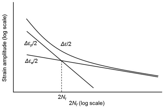 where is the fatigue strength coefficient, E is Young’s modulus, and is the number of cycles to failure. In addition, b is the fatigue strength exponent, is the fatigue ductility coefficient, and c is the fatigue ductility exponent [18]. These parameters are used to predict the fatigue life in low-cycle regions. In this relationship, as seen in Figure 3, a special life 2Nt when the life of the elastic part is equal to that of the plastic part is called the fatigue transition life.