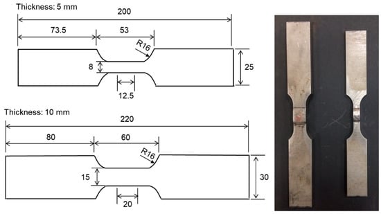 In order to maintain the cryogenic environment, nitrogen gas was sprayed over a test specimen installed inside the cryogenic chamber during LCF tests. All LCF tests were controlled by strain using an axial extensometer with a gauge length of 10 mm. The cyclic loading was a triangular waveform with a frequency of 0.5 Hz. Five different strain amplitudes (0.2, 0.3, 0.4, 0.5, and 0.6%) were employed in the LCF tests. As shown in Figure 4, the test specimens were manufactured as a flat-sheet type in accordance with ASTM E606, and welded using flux-cored arc welding (FCAW) [19]. In order to consider the thickness effect, test specimens with thicknesses of 5 mm and 10 mm were prepared.