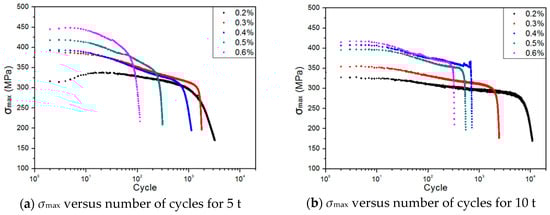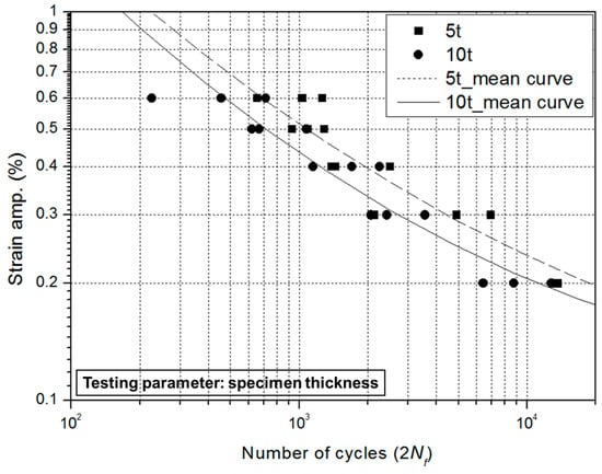 In general, there are three different characteristics (short hardening, slight softening, and significant secondary hardening) under the cyclic behavior of AISI 304L base metal [3,20]. It is noted that the softening behavior of AISI 304L depends on the applied strain amplitude. However, the cyclic behavior of the welded joint is different from that of the base metal. In the case of the welded joint, it can be seen that cyclic softening during LCF tests was observed in the entire region after finishing short hardening in the early cyclic region between 1 and 10 cycles. In particular, this result showed that the cyclic behavior of the welded joint was similar to a characteristic of weldment in [20]. Figure 6 shows the strain–life curves for two different thicknesses (5 mm and 10 mm) under a strain ratio of R = 0. The 5 t and 10 t described in figures and table are 5 mm thickness and 10 mm thickness, respectively. In the comparative results, it was observed a small difference between strain–life curves of 5 mm and 10 mm. This result is similar to a tendency in the high-cycle region wherein the fatigue strength is increased with a reduction in the specimen thickness. However, this is an experimental observation and more test data is required to explain the thickness effect.