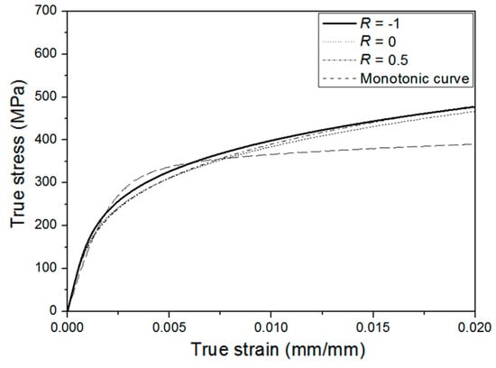 where is the stress amplitude and E is Young’s modulus. In addition, K′ is the cyclic strength coefficient, and n′ is the strain hardening exponent. It is well known that these parameters obtained by a linear regression in a log–log scale curve with different strain ratios are plotted as a linear curve. The Ramberg–Osgood equation can be employed to analyze the stress–strain relationship of notched members in combination with Neuber’s rule [17].