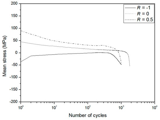 To investigate the strain ratio effect, LCF tests for specimens with a thickness of 10 mm were performed under three different strain ratios: R = −1, 0, and 0.5. In general, the cyclic stress–strain curve can be obtained by using the peak points in the stabilized hysteresis loops at various strain amplitudes. Figure 7 compares the cyclic stress–strain curves for three different strain ratios with a monotonic curve for a 10-mm-thick specimen. The results under R = 0 and 0.5 exhibited a little more cyclic softening compared to the tendency of R = −1. However, there is no significant difference owing to the changes in the strain ratios R = 0 and 0.5. In addition, a monotonic curve obtained from tensile test was located below those of the cyclic test results. This result demonstrates that the welded joint specimen also exhibits strong cyclic hardening that is similar to the behavior of the base metal. In particular, this characteristic is more significant at higher strain amplitudes. As mentioned earlier, the cyclic stress–strain curve is represented using Equation (1). Two parameters, K′ and n′, calculated by using log–log linear regression, are summarized in Table 5. Figure 8 shows the mean stress versus number of cycle curves at a strain amplitude of 0.4%. It is clearly observed that the amount of mean stress is relaxed to a very low value during earlier fatigue cycle regions. It is well known that mean stress relaxation depends on the amount of plastic deformation [2]. To compare the fatigue behaviors under three different strain ratios, the strain amplitude versus the number of cycles to failure is presented in Figure 9. Based on the comparison results, no particular trend with respect to different strain ratios is observed. This implies that changes in the strain ratio do not significantly affect the fatigue performance of a welded joint in low-cycle region. Many studies also demonstrated that an increased mean stress has more influence on the fatigue characteristics than the effect of the strain ratio in low-cycle regions [3,21].
