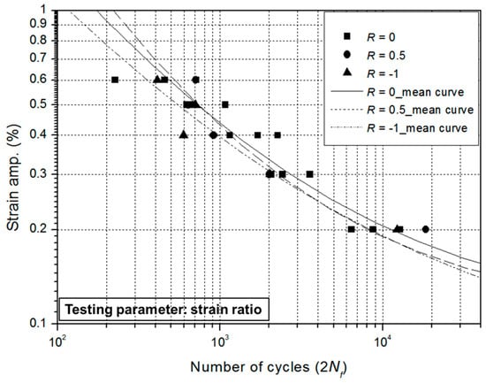 - Experimental investigations were conducted in order to identify the LCF behaviors under three different strain ratios. All of the cyclic stress–strain curves were compared to a stress–strain curve obtained from a monotonic test. Although a little softening occurred in the case of R = 0 and 0.5, this is not significantly different between various strain ratios such as R = −1, 0, and 0.5. In terms of the fatigue property, a distinct tendency between the three different strain ratios is not observed. These results implied that the strain ratio does not affect the fatigue strength in low-cycle region.