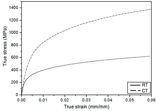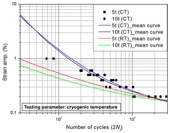 In order to examine the LCF behavior in a cryogenic environment, a series of fatigue tests were conducted at RT and CT, respectively. Figure 10 shows the cyclic stress–strain curves of a 10-mm-thick plate at RT and CT. Based on the cyclic stress–strain curves obtained from hysteresis behaviors, it can be seen that the cyclic yield strength at CT is significantly higher than that at RT owing to the cyclic hardening phenomenon. In addition, the results of the LCF test at RT are compared to those at CT, as shown in Figure 11. It is clearly seen that the fatigue performance at CT is significantly better than that at RT. In addition, this characteristic in the low-cycle region is similar to that in the high-cycle region. In general, it is well known that the fatigue resistance of structural steels increases at low temperature with an increase of the static strength [6,22].