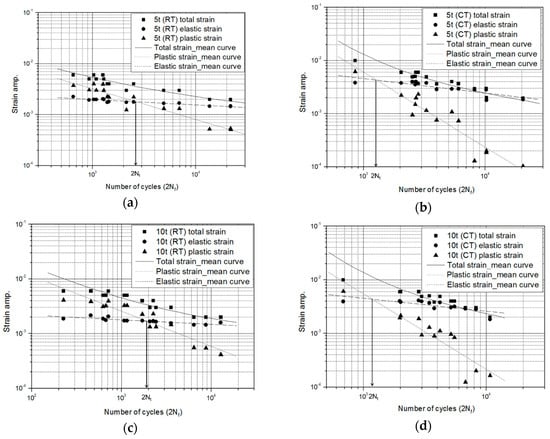 Transition life in strain–life curve for 5 mm and 10 mm under strain ratio R = 0. (a) Transition life (2Nt) for 5 t at RT; (b) Transition life (2Nt) for 5 t at CT; (c) Transition life (2Nt) for 10 t at RT; (d) Transition life (2Nt) for 10 t at CT.