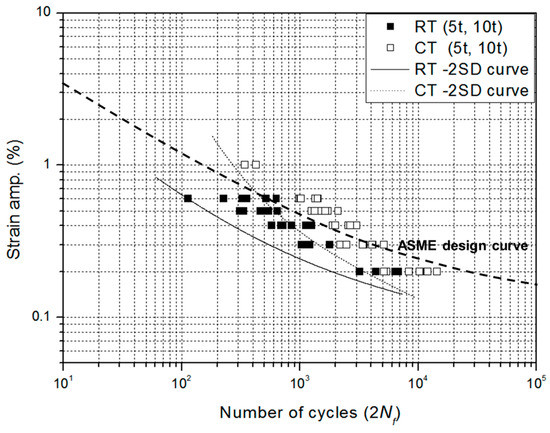 As shown in Figure 13, the LCF design curve obtained from the experimental results by this study is compared to the existing LCF design curve for AISI 304 established by the American Society of Mechanical Engineers (ASME) code [25]. The design curve for an AISI 304L welded joint is determined based on a mean-minus-two standard deviation curve, which is associated with a 97.7% probability of survival, including test data at 5 t and 10 t. In the ASME code, LCF design curves for carbon steels, low-alloy steels, and austenitic stainless steels are suggested. In particular, the factors to cover the effects of variables such as experimental scatter surface finish, component size, and loading history are suggested to evaluate the fatigue life. As seen in the comparison, the LCF test results obtained by this experimental study exhibit lower fatigue performance compared to the ASME design curve. This implies that the ASME design curve did not properly reflect the fatigue characteristics of AISI 304L welded joints. This result also showed that the fatigue performance in low-cycle regions is significantly affected by stress concentration owing to weld geometry. In [26], it was demonstrated that a weld discontinuity is the most influential for early fatigue crack initiation at the weld toe. It is noted that although the ASME code does not reflect the effect of weld geometry, it gives specific curves or quantitative factors for considering operational environments such as elevated temperature, strain rate, and dissolved oxygen (DO) level.