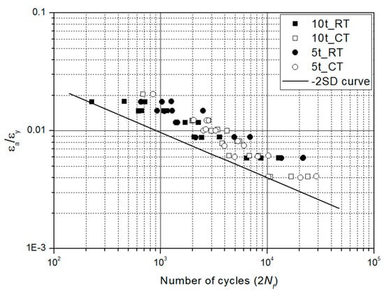 The cyclic yield strength (σcy) can be defined at a 0.2% strain offset, which corresponds to a plastic strain of 0.002 on the cyclic stress–strain curve. In this regard, the cyclic yield strain (εcy) also can be identified based on the cyclic stress–strain curve, as shown in Figure 14. As seen in Figure 13, test data obtained at RT and CT are scattered on the both narrow bands. In order to determine the fatigue design, mean-minus-two standard deviation (−2SD) curve with 97.7% probability of survival is considered in this study. The standard deviation relevant to normalized strain–life curve quantifies the distribution of Log 2Nf about the mean curve. Figure 15 shows the normalized strain–life curve obtained by using cyclic yield strains corresponding to RT and CT. This result shows that all of the LCF test data are consolidated into a narrow band normalized by the corresponding yield strain. This means that the minus-two standard deviation curve obtained by the normalized method can be used for the design of a welded structure in low-cycle region.