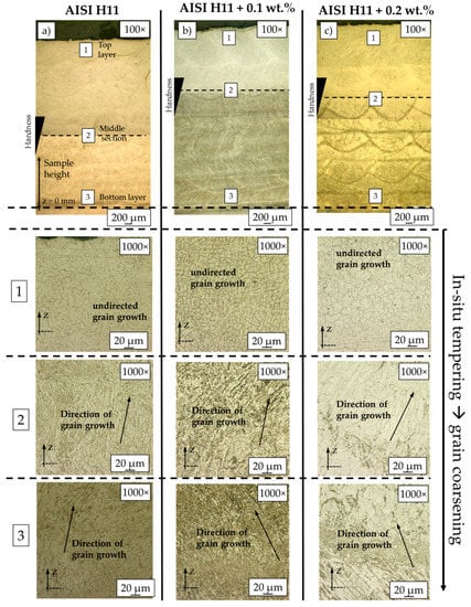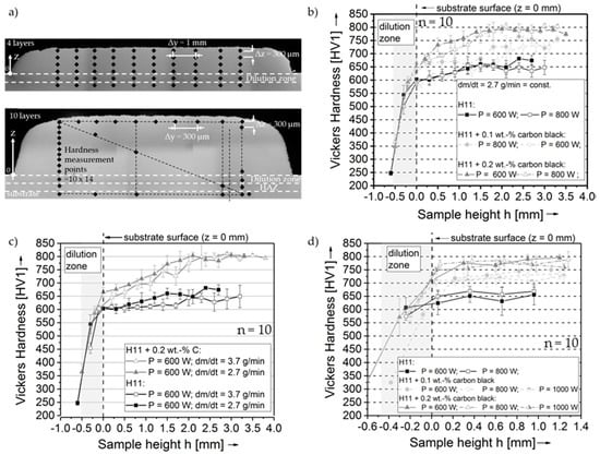 - Telasang, G.; Majumdar, J.D. Effect of laser parameters on microstructure and hardness of laser clad and tempered AISI H13 tool steel. Surf. Coat. Technol. 2014, 258, 1108–1118. [Google Scholar] [CrossRef]
