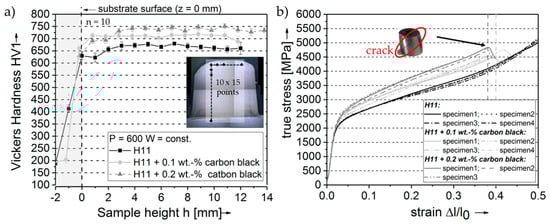 Hentschel, O.; Siegel, L.; Scheitler, C.; Huber, F.; Junker, D.; Gorunow, A.; Schmidt, M. Processing of AISI H11 Tool Steel Powder Modified with Carbon Black Nanoparticles for the Additive Manufacturing of Forging Tools with Tailored Mechanical Properties by Means of Laser Metal Deposition (LMD). Metals 2018, 8, 659. https://doi.org/10.3390/met8090659