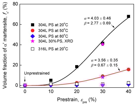 Volume fraction of α′ obtained by Feritscope for 304L and 316L specimens un-prestrained and prestrained (PS) at different temperatures. The fitting curves based on the relation proposed by Olson and Cohen [] are also depicted: , where n is a fixed exponent having a value of 4.5, and and are temperature-dependent parameters, which decrease with increasing temperature, in agreement with [].