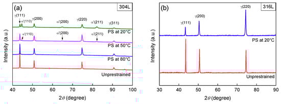 XRD patterns of 304L (a) and 316L (b) steel specimens un-prestrained and prestrained (PS) to 30% strain at different temperatures. The (220)γ reflection becomes dominant after prestraining, indicating that texture changes also occur due to the uniaxial tensile prestrain.