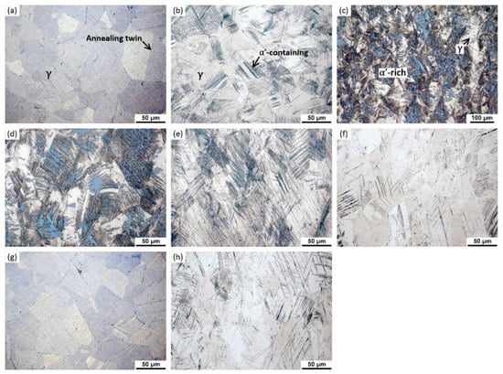 OM images: (a) 304L un-prestrained; (b) 304L prestrained to 10% at 20 °C; (c,d) 304L prestrained to 30% at 20 °C; (e) 304L prestrained to 30% at 50 °C; (f) 304L prestrained to 30% at 80 °C; (g) 316L un-prestrained; (h) 316L prestrained to 40% at 20 °C. The etched dark regions within the bunches of shear bands contain α′ martensite; the darker the region, the more the α′ martensite.