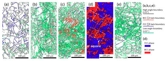 Boundary characteristics identified by EBSD are shown in Figure 4. Un-prestrained 304L specimen contains annealing twin boundaries, Figure 4a. But twin boundaries in 20 °C 20% and 30% prestrained 304L specimens appear irregular and fragmented, Figure 4b,c. These twin boundaries are expected to consist of both annealing and deformation twin boundaries. Typically, annealing twin boundaries after deformation appear fragmented because the concurrent deformation and grain rotation can convert a twin boundary, fully or in part, into an ordinary high angle grain boundary []. It is difficult to distinguish the two types of twin boundaries, however the fragmented twin boundaries are more likely to indicate the generation of new deformation twins [], because the twin boundaries are more in the 30% prestrained specimen than in the 20% prestrained specimen. This also indicates that with increasing prestrain the amount of deformation twins increases. In fact, it has been established that the amount of deformation twins in 300 series ASSs increases with prestrain [,,,]. Shen et al. [] found that the fraction of deformation twins in 304 steel increased with increasing strain for strain level less than 57%; the volume fraction of deformation twins was about 17% at the strain level of 20%. However, there are only a few twin boundary fragments in the 80 °C prestrained 304L specimen, it appears that no significant deformation twin was generated by warmly prestraining.