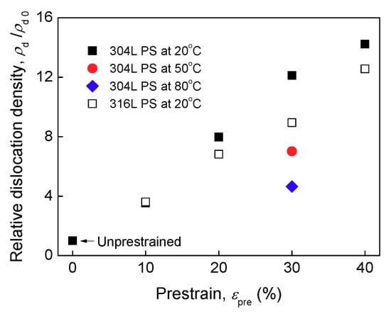 Based on Equation (5), was calculated, Figure 10a. of un-prestrained 304L and 316L steels are and , respectively, in good agreement with data reported [,] ( ) for solution-annealed ASSs. Thus, calculated by Equation (5) is acceptable. Figure 10a shows that in 304L steel is significantly increased by prestrain at 20 °C. The higher the prestrain applied the higher the . are and , respectively, in 30 and 40% prestrained specimens, being about 22 and 51 times higher than that of the un-prestrained 304L specimen. However, of 304L specimens prestrained to 30% and 40% at 50 °C are just slightly higher than that of un-prestrained specimen, and of specimens prestrained to 30% and 40% at 80 °C are very close to that of un-prestrained specimens. of 304L specimens with a lower level of prestrain at higher temperatures, i.e., 10% at 50 °C and 10% and 20% at 80 °C, are even slightly lower than that of un-prestrained specimen. These results indicate that prestrains at 50 and 80 °C, particularly at 80 °C, have a relatively lesser influence on of 304L steel, compared with prestrains at 20 °C. In addition, prestrains at 20 °C also have a lesser influence on of 316L steel.