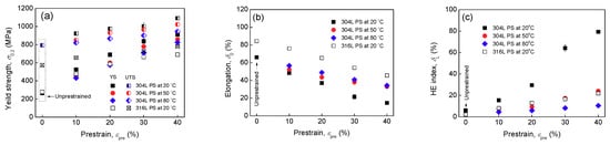 In more stable 316L steel after prestraining at 20 °C and 304L steel after prestraining at higher temperatures, dislocation densities are also significantly increased, Figure 5. However, their HE degrees are just slightly increased, Figure 6c. Thus, the prestrain-induced increase in dislocation density has relatively little influence on the HE of ASSs. On the contrary, for 304L specimens prestrained at 20 °C, a large fraction of α′ was induced by prestraining, consequently their HE was markedly enhanced.