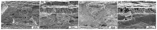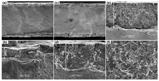 Brittle region of un-prestrained 304L specimen exhibits quasi-cleavage (QC) fracture with some flat facets (FFs) and secondary cracks (SCs), Figure 7b, which is typical fracture characteristic of HE in metastable 300 series ASSs [,,,,,,,]. As mentioned, FFs can be related to hydrogen-assisted twin boundary cracking [,,]. Nevertheless, besides QC fracture, FFs and SCs, 20 °C prestrained 304L steel also show intergranular (IG) fracture, Figure 7d,f and Figure 9b indicate more severe HE. The depth of brittle region, number of FFs, and proportion of IG fracture increase with prestrain, indicating that HE increases with prestrain, in line with the trend of HE index calculated by Equation (3). The results imply that a higher prestrain can modify the HE mechanism of metastable 304L steel.