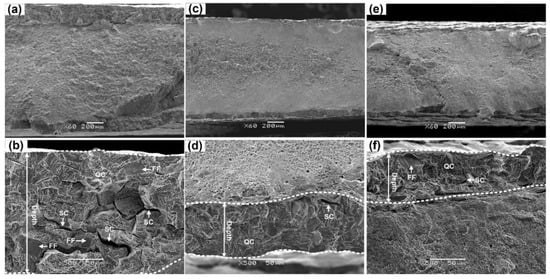 SEM fracture surfaces of the 304L steel specimens: (a,b) Un-prestrained; (c,d) prestrained to 20% at 20 °C; (e,f) prestrained to 40% at 20 °C.