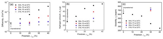 where, and are length and perimeter of specimen at gauge cross-section, respectively, and is density. Inserting and values into Equations (5) and (6), solubility was calculated, Figure 10c. The results indicate that in 304L steel decreases with increasing prestrain at 20 °C, particularly for prestrain higher than 20%, whereas of 316L steel prestrained at 20 °C and of 304L steel prestrained at higher temperatures are slightly higher than their un-prestrained specimens. The results indicate that a high level of prestrain at 20 °C can decrease significantly the apparent solubility of 304L steel, whereas a prestrain at higher temperatures has relatively little influence on the solubility. A prestrain even at 20 °C has little influence on the apparent solubility of 316L steel.