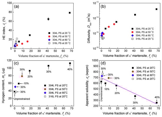Many studies [,,,,,,] have regarded α′ induced by prior deformation as the key contributor to enhanced HE of 300 series ASSs. Clearly, the significant increase in HE of 304L steel after a higher prestrain at 20 °C can also be attributed to α′. Figure 11a depicts HE indexes of all specimens as a function of α′ fraction. Regardless of prestrain and temperature, HE index is directly proportional to α′ content. The studies [,,,,,,] believed that the role of pre-existing α′ is to provide diffusion “highways” during hydrogen exposure. To verify this, Figure 11b,c display and values, respectively, as a function of α′. Both and increases with α′ fraction. Thus, it is undeniable that pre-existing α′ can act as diffusion “highways”, enhancing transport rate and hydrogen uptake during hydrogen exposure. With increasing prestrain, since the content of α′ increases, the hydrogen transport rate and total hydrogen amount entering is increased, the HE of metastable 304L steel is more severe. On the contrary, since the α′ is less significant in the prestrained 316L steel and the warmly prestrained 304L steel, their are less affected and their HE is less severe.